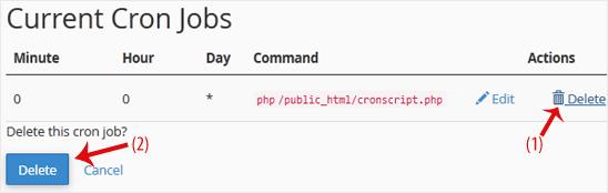 1. Under Current Cron Jobs, locate your cronjob and click on Delete.