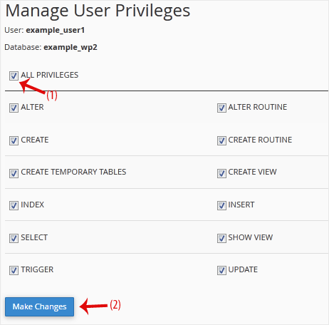 5. On Manage User Privileges. Mark the box ALL PRIVILEGES and click on Make Changes.