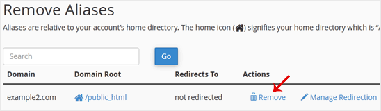 Under Remove Aliases, locate the parked domain name and click on Remove.