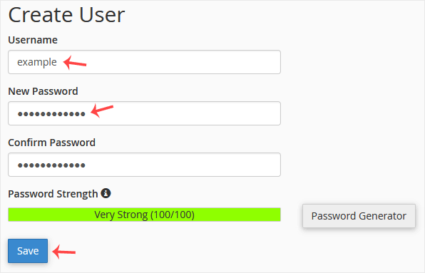 7. Scroll down the page. Under Create User, fill in the username and password fields or use the Password Generator option to generate a new random password and copy it to Notepad. Click on Save.