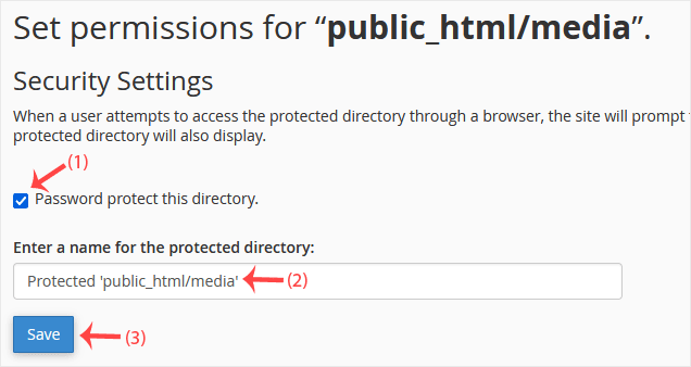 5. Under Security Settings, check-mark Password protect this directory. Then click on Save.